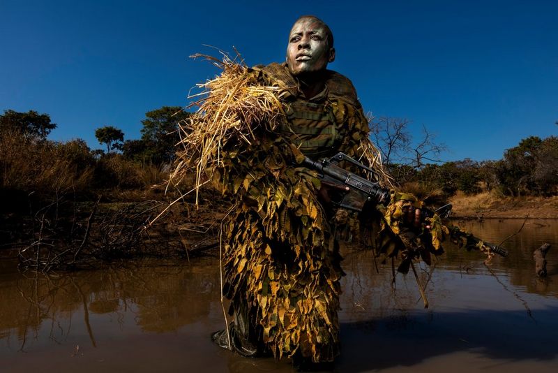 In this image by Canon Ambassador and documentary photographer Brent Stirton, an elite unit of conservation rangers trained to combat militia groups emerges from the bush in Virunga National Park, Democratic Republic of the Congo, after waiting for hours in an ambush position. Taken on a Canon EOS-1D X (now succeeded by the Canon EOS-1D X Mark III) with a Canon EF 24-70mm f/2.8L II USM lens at 28mm, 1/500 sec, f/7.1 and ISO200. © Brent Stirton